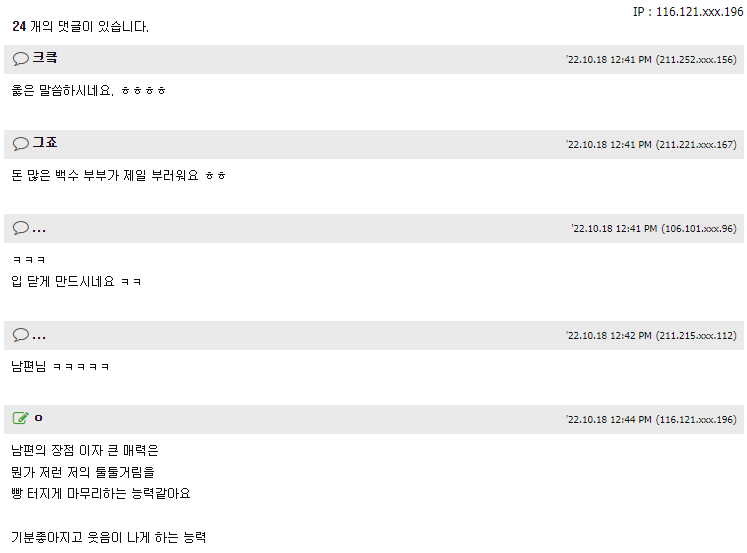 [is_secret] => [date] => 1666682284 [datetime] => 22-10-25 16:18 [best] => [ip] => 116.♡.74.83 [is_reply] => [is_edit] => [is_del] => ) [5] => Array ( [wr_id] => 482605 [wr_num] => -140934 [wr_reply] => [wr_parent] => 474937 [wr_is_comment] => 1 [wr_comment] => 1 [wr_comment_reply] => [ca_name] => [wr_option] => [wr_subject] => [wr_content] => 피식~ 같이 웃음 된거죠 [wr_link1] => [wr_link2] => [wr_link1_hit] => 0 [wr_link2_hit] => 0 [wr_hit] => 0 [wr_good] => 3 [wr_nogood] => 0 [mb_id] => naver_8ea10898 [wr_password] => *128476990595AB5C4C0C3DB1DC117F2CD291FD23 [wr_name] => 야봉 [wr_email] => [wr_homepage] => [wr_datetime] => 2022-10-24 12:12:19 [wr_file] => 0 [wr_last] => [wr_ip] => 106.101.65.220 [wr_facebook_user] => [wr_twitter_user] => [articleid] => [wr_1] => [wr_2] => [wr_3] => [wr_4] => [wr_5] => [wr_6] => [wr_7] => [wr_8] => [wr_9] => [wr_10] => [as_type] => 0 [as_shingo] => 0 [as_img] => 0 [as_list] => 0 [as_publish] => 0 [as_extra] => 0 [as_extend] => 0 [as_level] => 168 [as_download] => 0 [as_down] => 0 [as_view] => 0 [as_lucky] => 0 [as_poll] => 0 [as_star_score] => 0 [as_choice] => 0 [as_choice_cnt] => 0 [as_re_mb] => [as_re_name] => [as_tag] => [as_map] => [as_icon] => [as_thumb] => [as_video] => [as_update] => [as_star_cnt] => 1 [ast_read] => 0 [ast_adlist_edate] => 0 [ast_adtop_edate] => 0 [ast_extend] => [ast_ultra_extend] => [wr_besttime] => 2022-10-27 01:18:14.575139 [name] =>