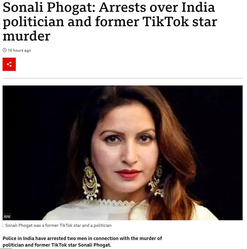 전직 뉴스앵커 및 유명 틱톡커이자 여러 드라마 영화 출연으로 인도에서 널리 알려진 인도 인민당 (BJP) 소속 여성 정치인 소날리 포가트 (42세)