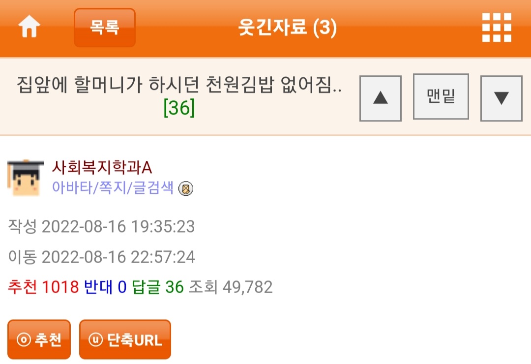 할머니께서 하시던 천원 김밥집이 사라짐