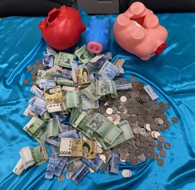 충남 공주 금학동에 사는 오경민(12)·오누리(10) 형제가 경찰지구대 앞에 놓고 간 돼지저금통에서 나온 동전과 지폐들.