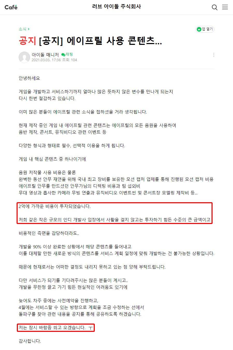 에이프릴 게임 제작중이던 회사 공지