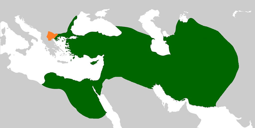 주황색 시작지에서 전 그리스를 통합한 이후 페르시아 제국(초록색 영역)을 멸망시키고,