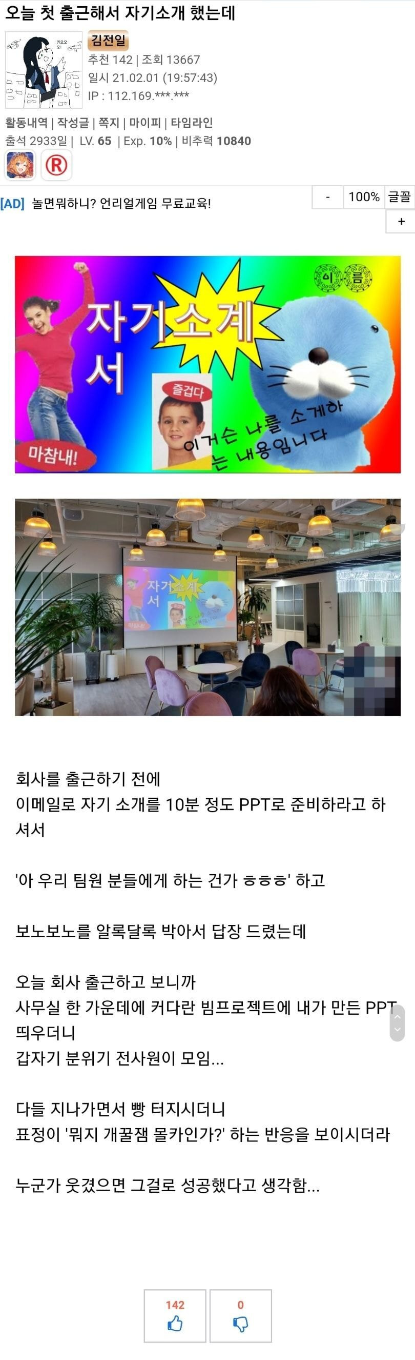 오늘 첫 출근해서 자기소개 했는데 - 꾸르