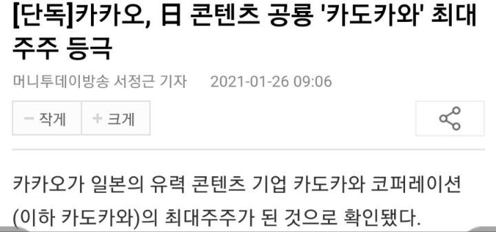 카카오 일본 컨텐츠 공룡 카도카와 최대주주 등극 0 3952 0 이슈야 2021.01.29 21:16 이전 글 목록으로 다음 글 카카오 일본 컨텐츠 공룡 카도카와 최대주주 등극꾸준히 지분 사들였던 카카오카도카와는 라노벨 애니 만화 게임 웹툰등 일본의 다양한 컨텐츠 산업 핵심 기업 0 HOT