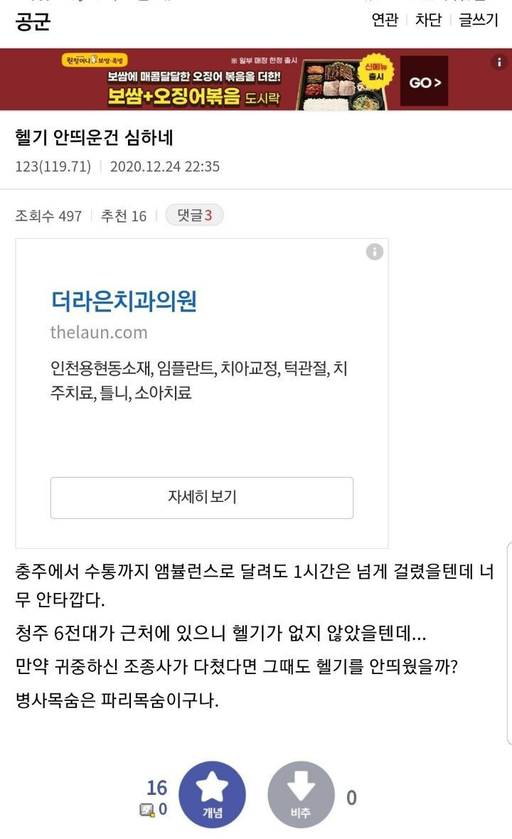 병사 사고난 비행단 정훈실에 민원 넣는 공군갤러들 0 3313 1 이슈야 2021.01.03 19:53 이전 글 목록으로 병사 사고난 비행단 정훈실에 민원 넣는 공군갤러들 1 HOT