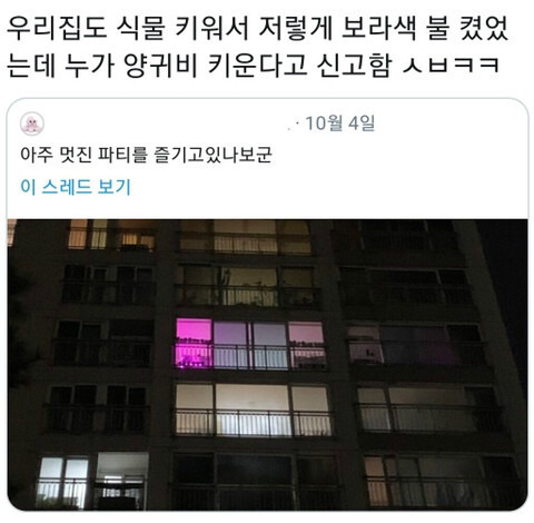 아파트에 꼭 하나씩 있는 오해받거나 신고당하는 집 1 5215 0 이슈야 2020.12.18 08:49 이전 글 목록으로 다음 글 아파트에 꼭 하나씩 있는 오해받거나 신고당하는 집식물 키우는 스펙트럼 조명이라고 하는데무당집으로 오해하거나 이상한거 키운다고 하거나 별의별 소리를 다 듣는다고함 0 HOT