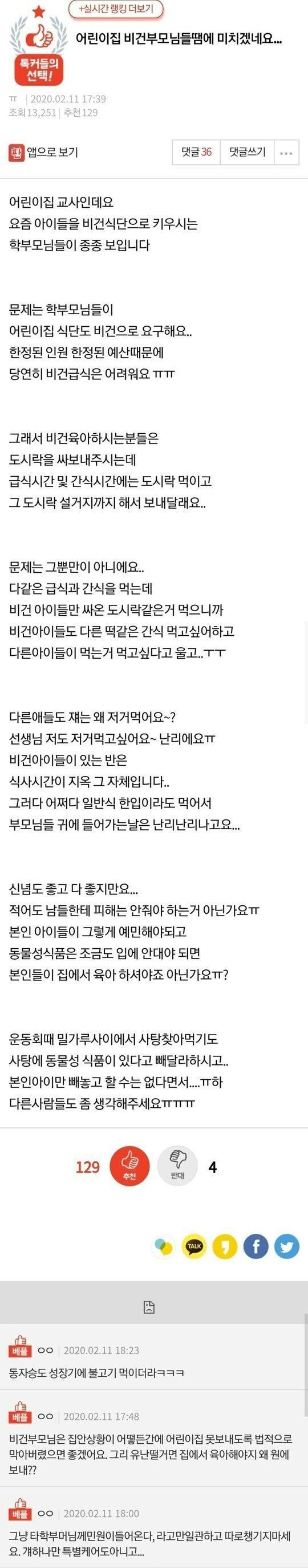 어린이집 비건 부모님들 때문에 미치겠네요 - 꾸르