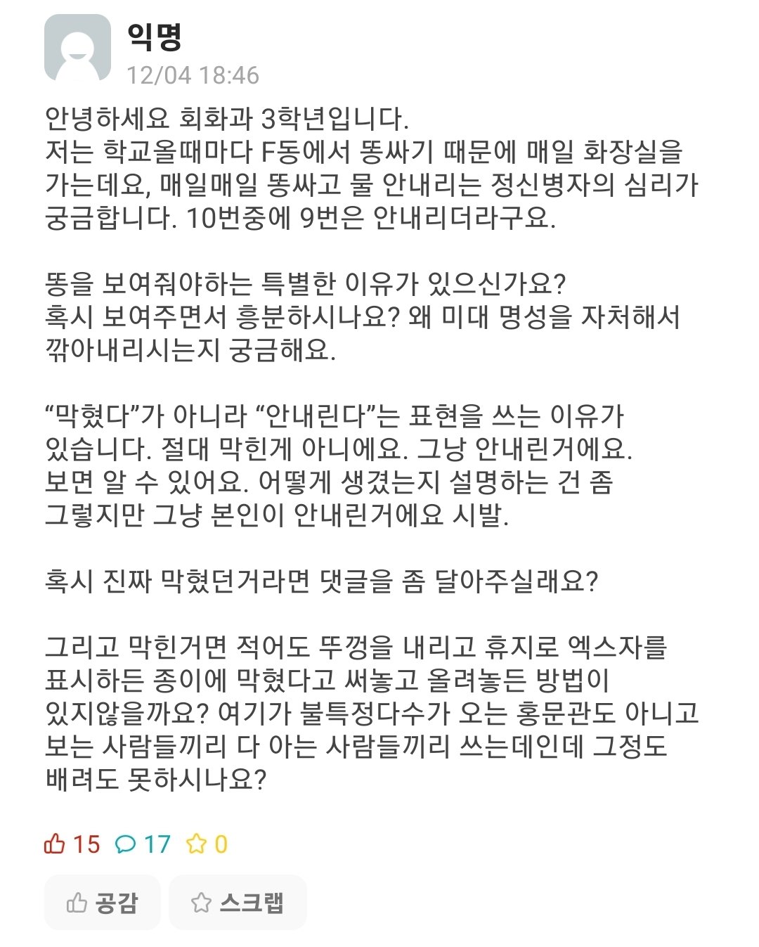 왜 똥싸고 물을 안내리는지가 정말 궁금한 에타녀